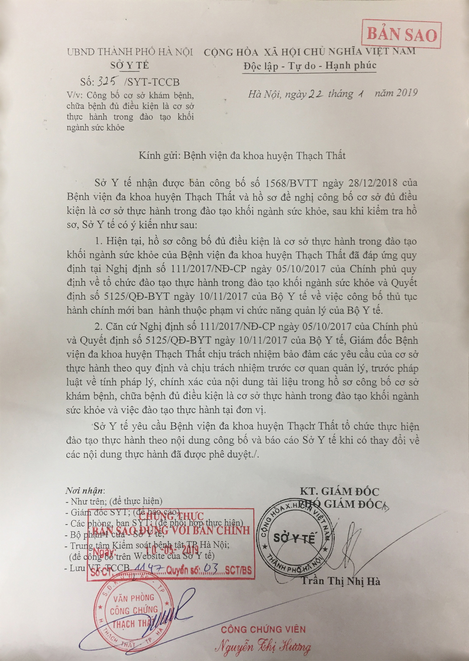 Sở Y tế nhận được bản công bố số 1568/BVTT ngày 28/12/2018 của Bệnh viện đa khoa huyện Thạch Thất và hồ sơ đề nghị công bố cơ sở đủ điều kiện là cơ sở thực hành đào tạo khối ngành sức khỏe, sau khi kiểm tra hồ sơ, Sở Y tế có ý kiến như sau: