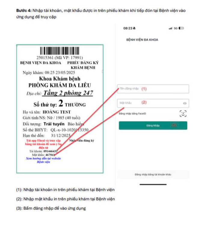Bước 3: Đăng nhập phần mềm-> Sử dụng tài khoản+ mật khẩu in trên phiếu đăng ký khám