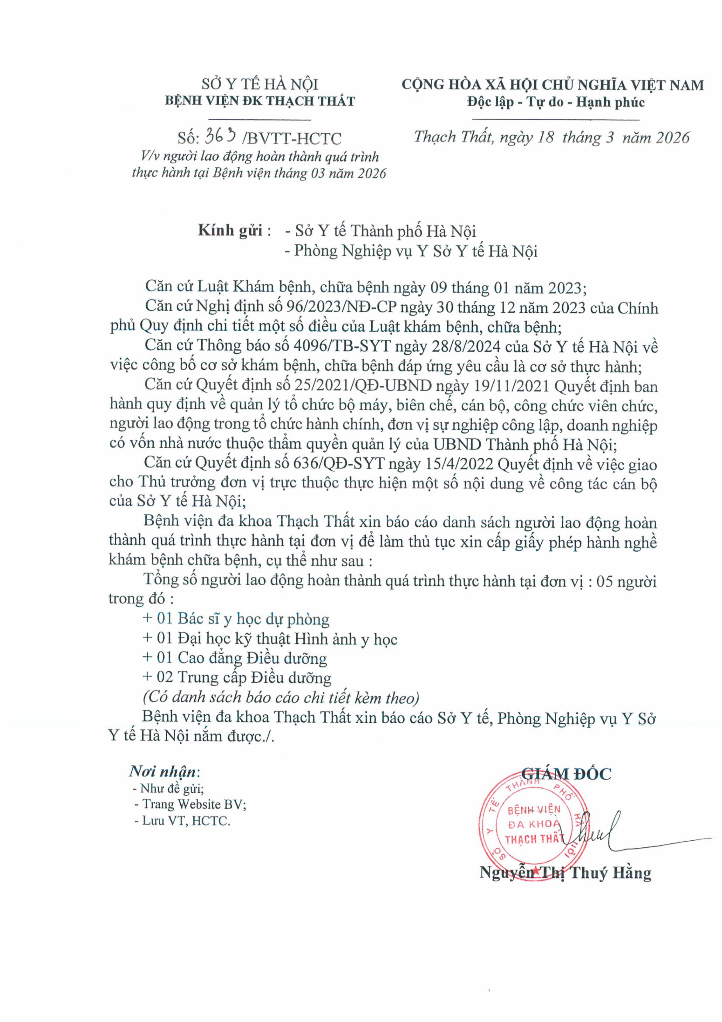 Thông báo người lao động hoàn thành quá trình thực hành tại Bệnh viện Thạch Thất tháng 3 năm 2026