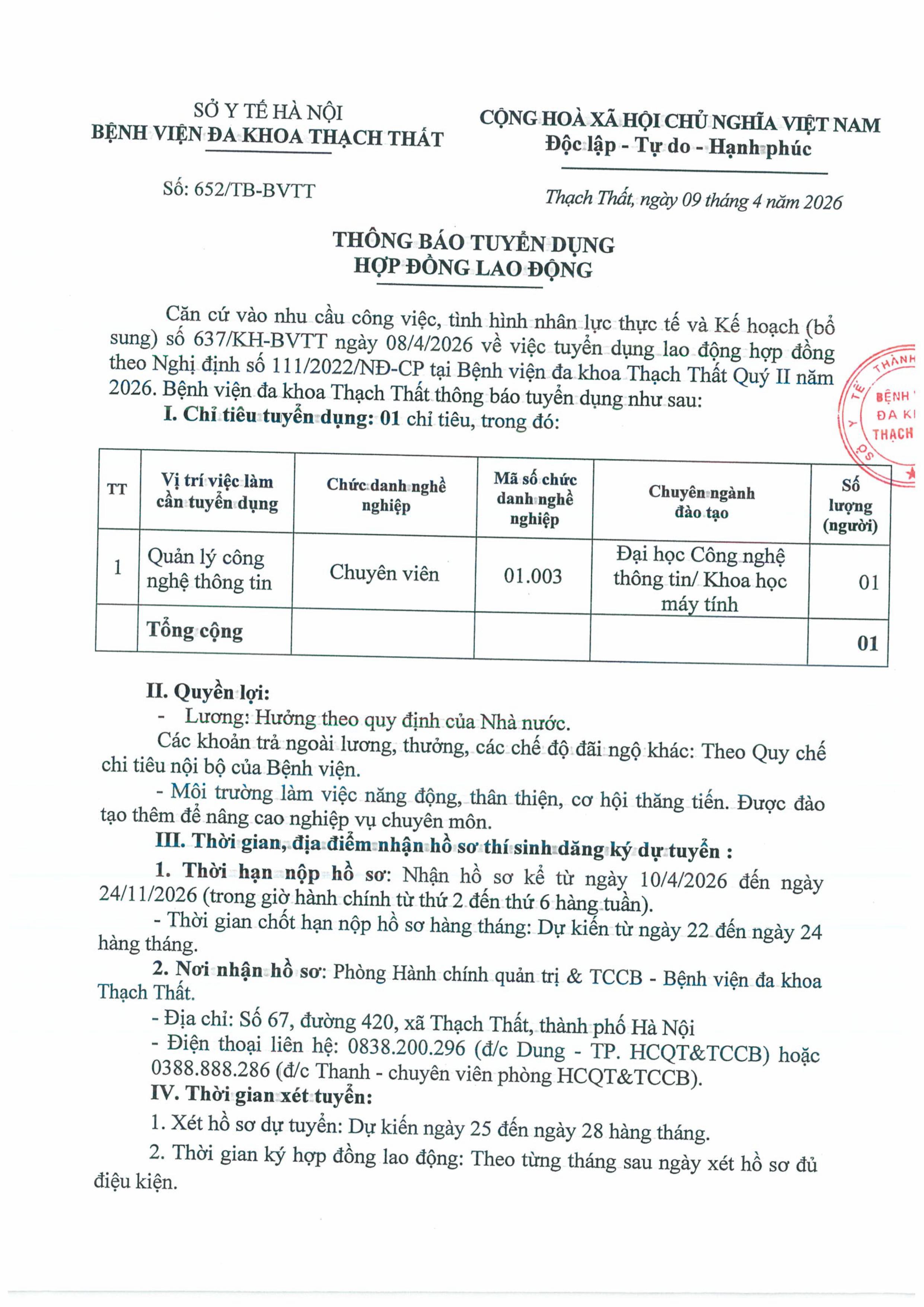 Thông báo kết quả vòng 2 thi vấn đáp tuyển dụng viên chức vào làm việc tại Bệnh viện đa khoa Thạch Thất năm 2025