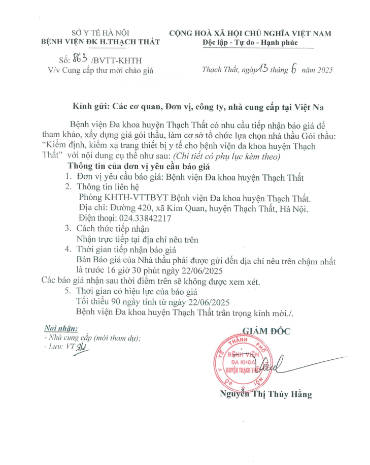Thư mời báo giá: gói thầu sửa chữa hệ thống số hóa X Quang kỹ thuật số CR của bệnh viện đa khoa huyện Thạch Thất