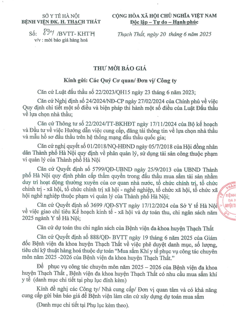 THƯ MỜI CHÀO GIÁ HÓA CHẤT XÉT NGHIỆM, SINH PHẨM Y TẾ VÀ DỊCH VỤ