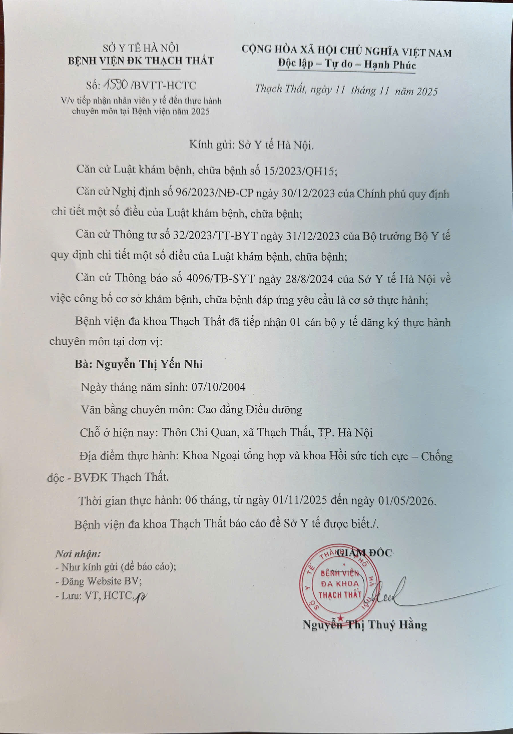 Thông báo số 1590/BVTT-HCTC về việc tiếp nhận nhân viên y tế đến thực hành chuyên môn tại BV T11/2025