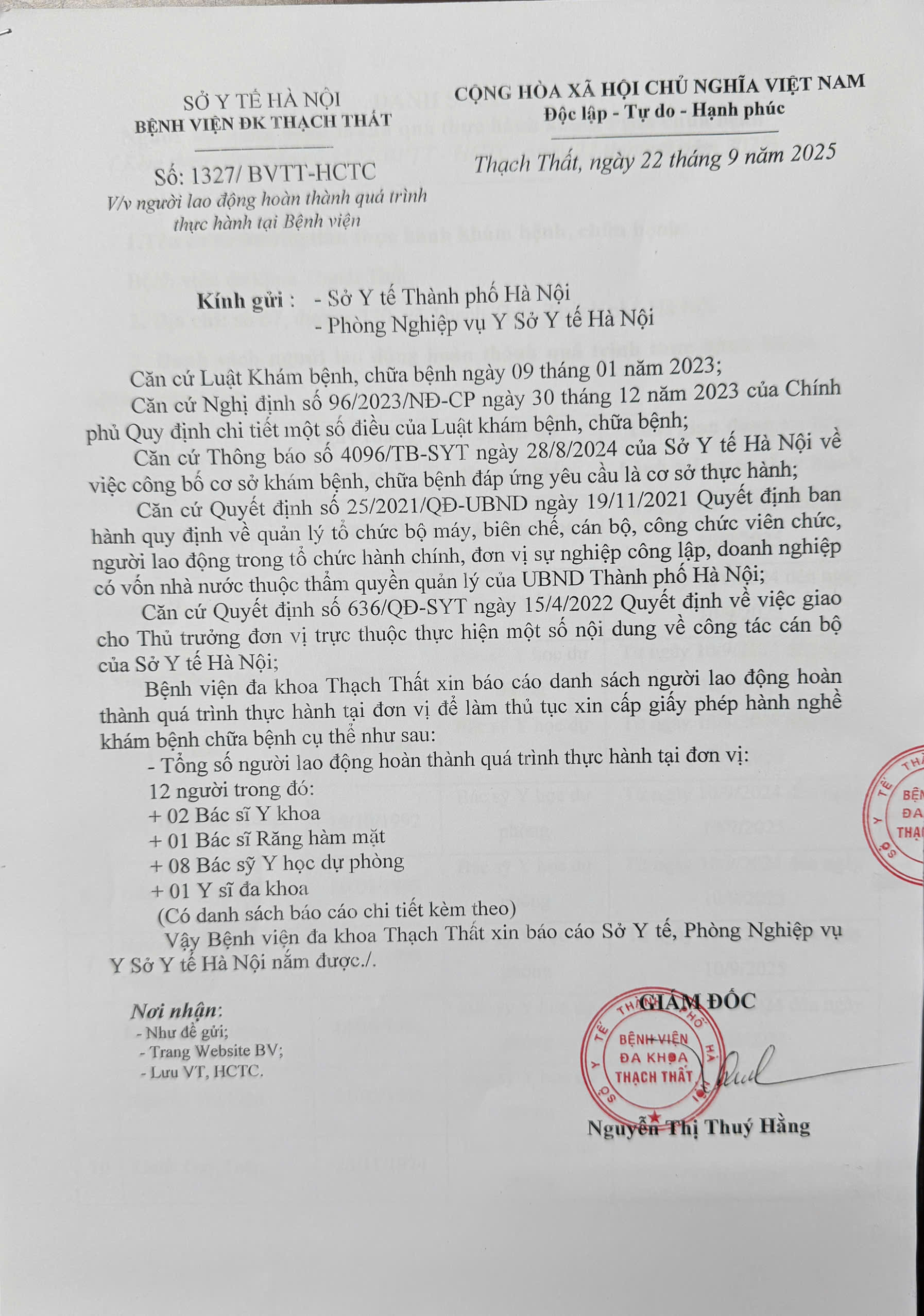 Thông báo về việc người lao động hoàn thành quá trình thực hành tại bệnh viện số 1327