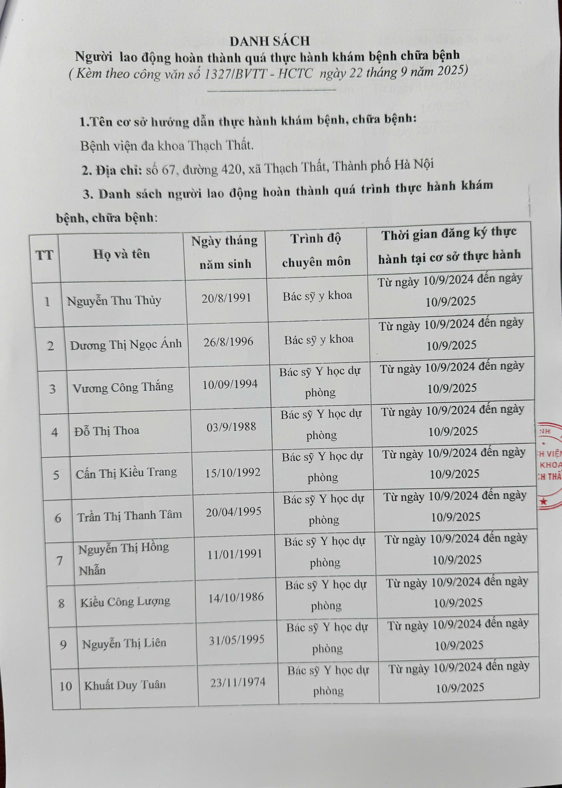 Thông báo về việc tiếp nhận nhân viên y tế đến thực hành chuyên môn tại BV T10/2025