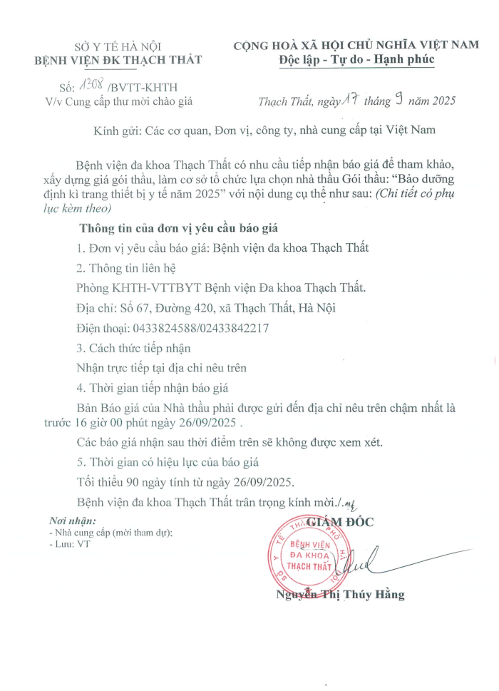 Thư mời báo giá: gói thầu sửa chữa hệ thống số hóa X Quang kỹ thuật số CR của bệnh viện đa khoa huyện Thạch Thất
