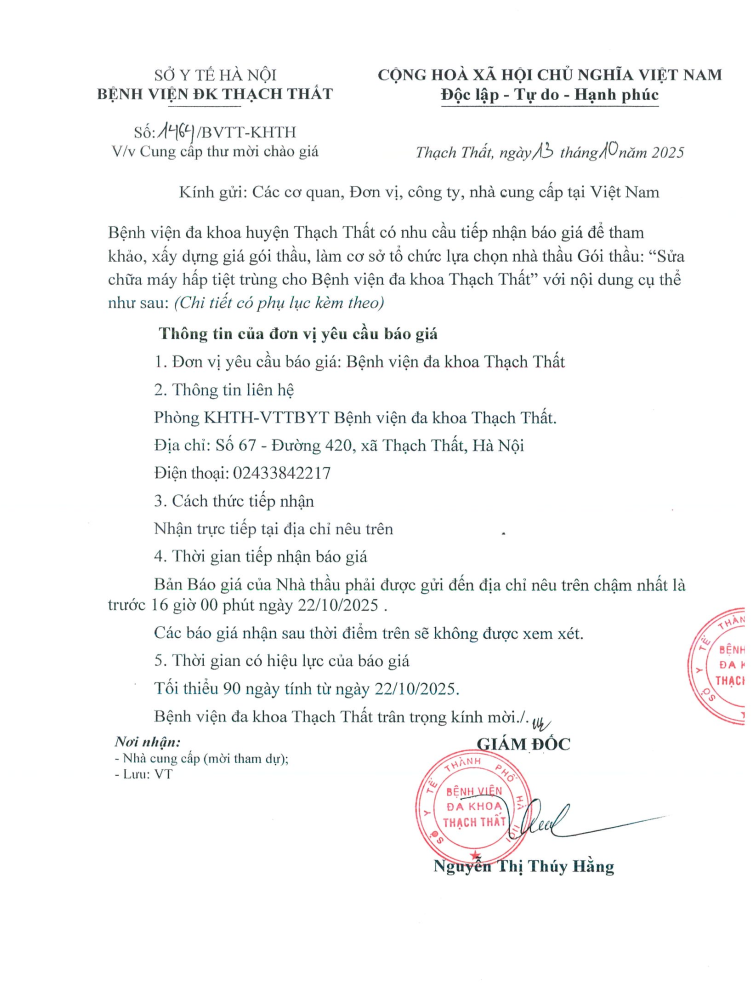 Thư mời báo giá: gói thầu sửa chữa hệ thống số hóa X Quang kỹ thuật số CR của bệnh viện đa khoa huyện Thạch Thất
