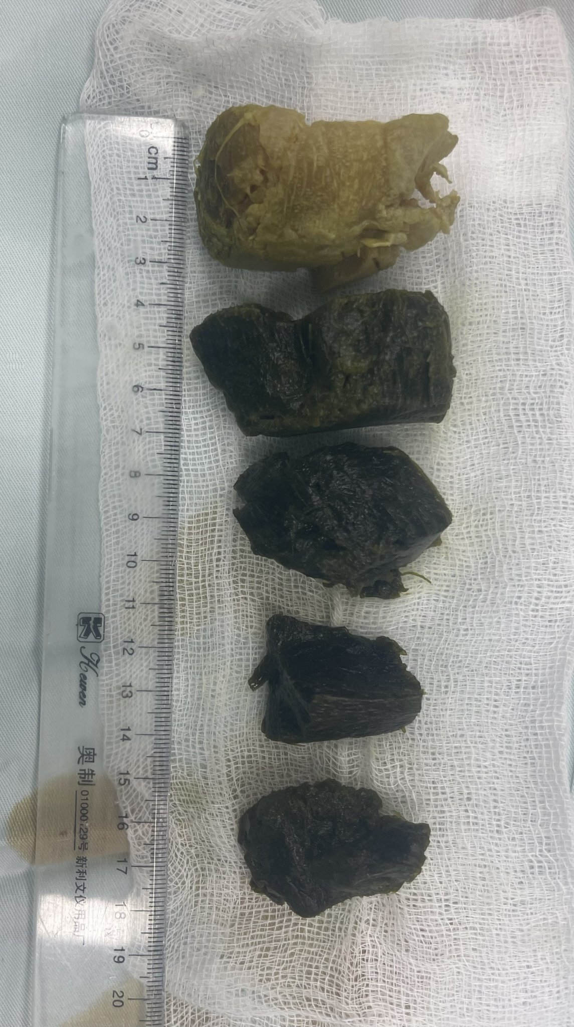 Bệnh nhân được đưa lên phòng mổ gây mê và tiến hành phẫu thuật. BSCKII Vương Trung Kiên trực tiếp phẫu thuật cho bệnh nhân cho biết lấy ra được 5 khối bã thức ăn trong lòng ruột non, khối to nhất có kích thước khoảng 6×3cm, khối nhỏ nhất kích thước khoảng 4×2cm. Các khối bã thức ăn này thường là do khối thức ăn không tiêu hóa được bị vón cục lại trong dạ dày rồi di chuyển xuống ruột non tạo thành một cái “Nút” gây tắc ruột.