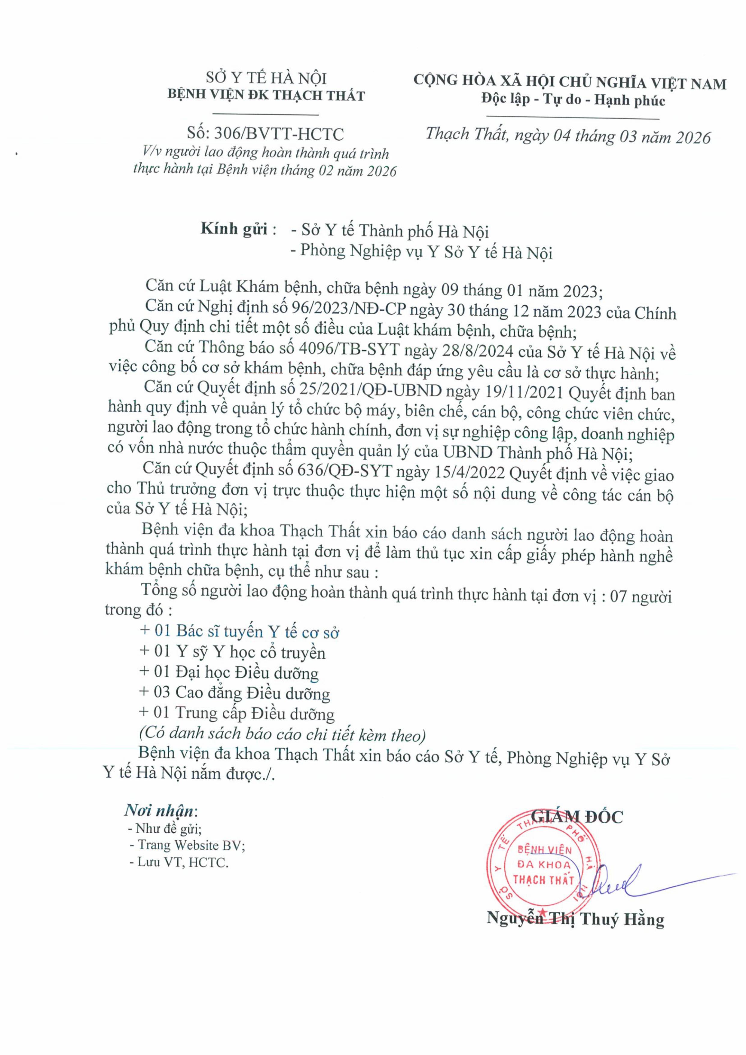 Thông báo người lao động hoàn thành quá trình thực hành tại Bệnh viện tháng 2 năm 2026