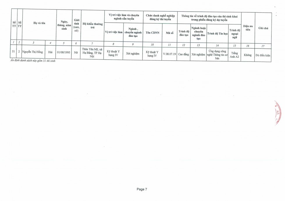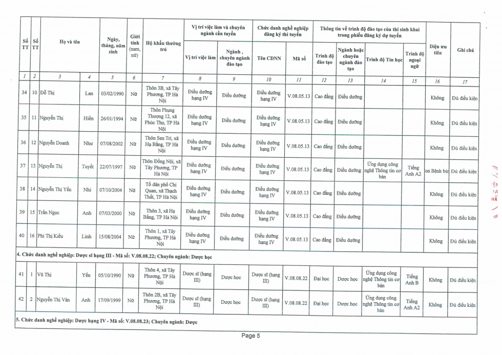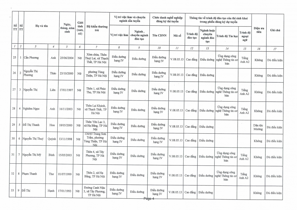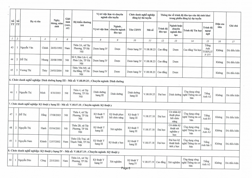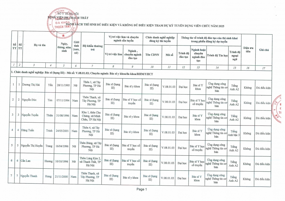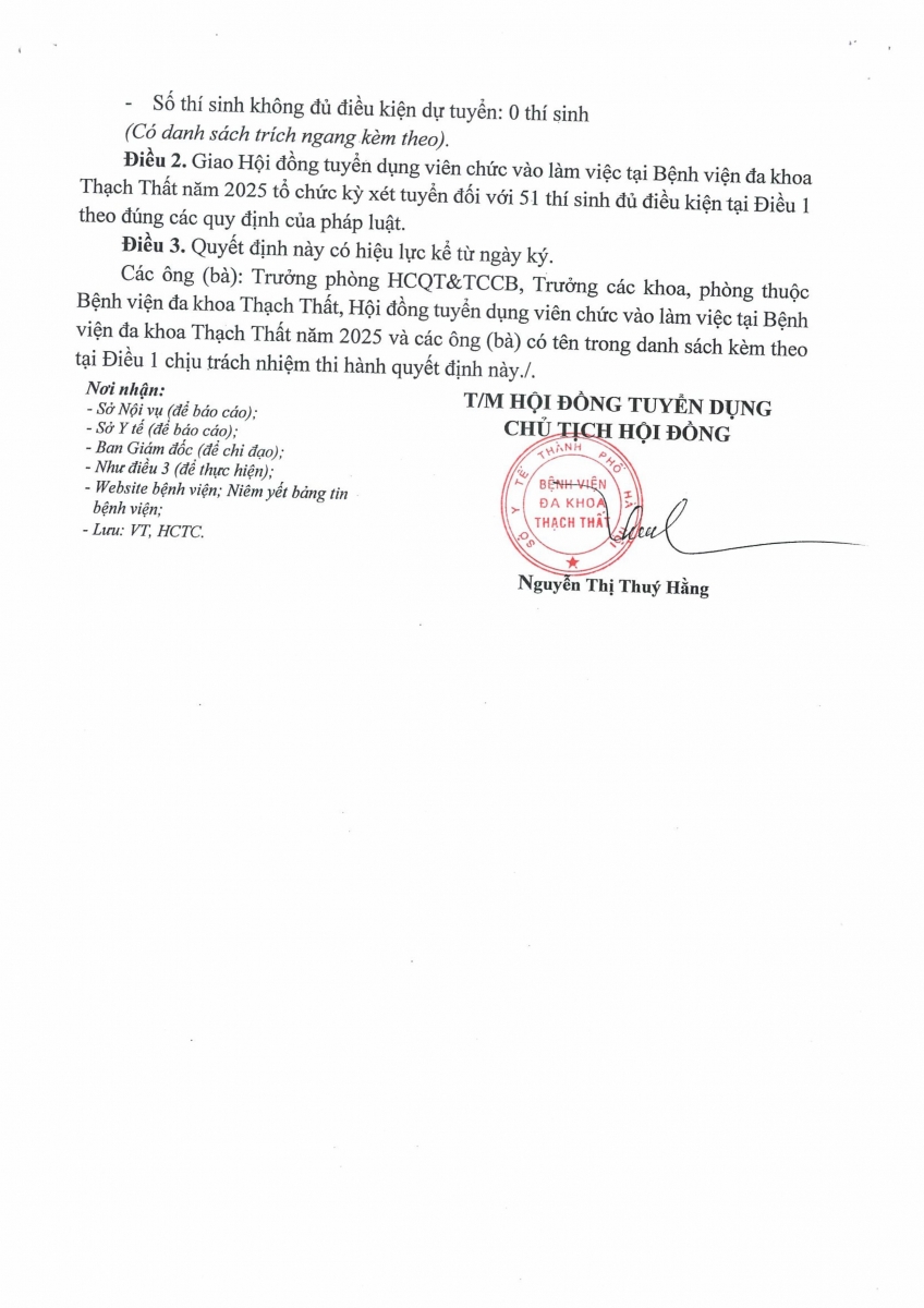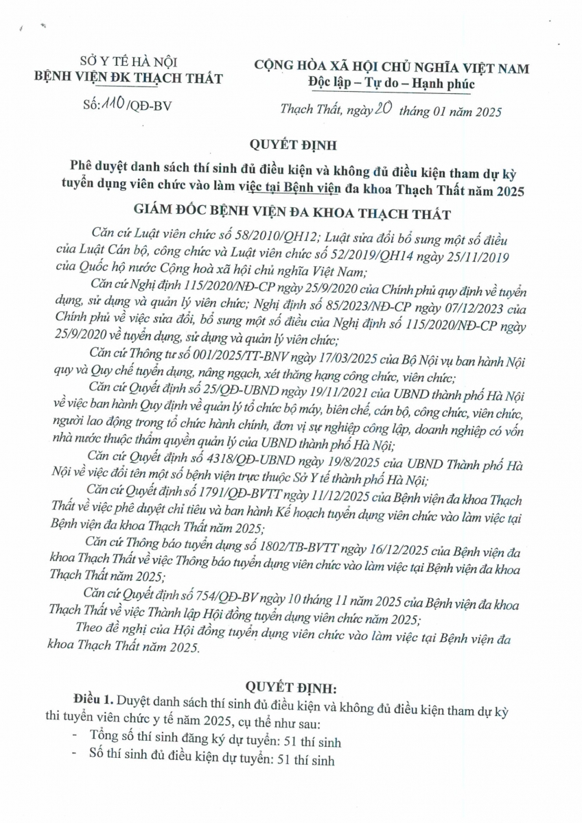 Quyết định phê duyệt danh sách thí sinh đủ điều kiện và không đủ điều kiện tham dự kỳ tuyển dụng viên chức vào làm việc tại Bệnh viện đa khoa Thạch Thất năm 2025