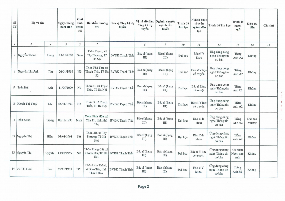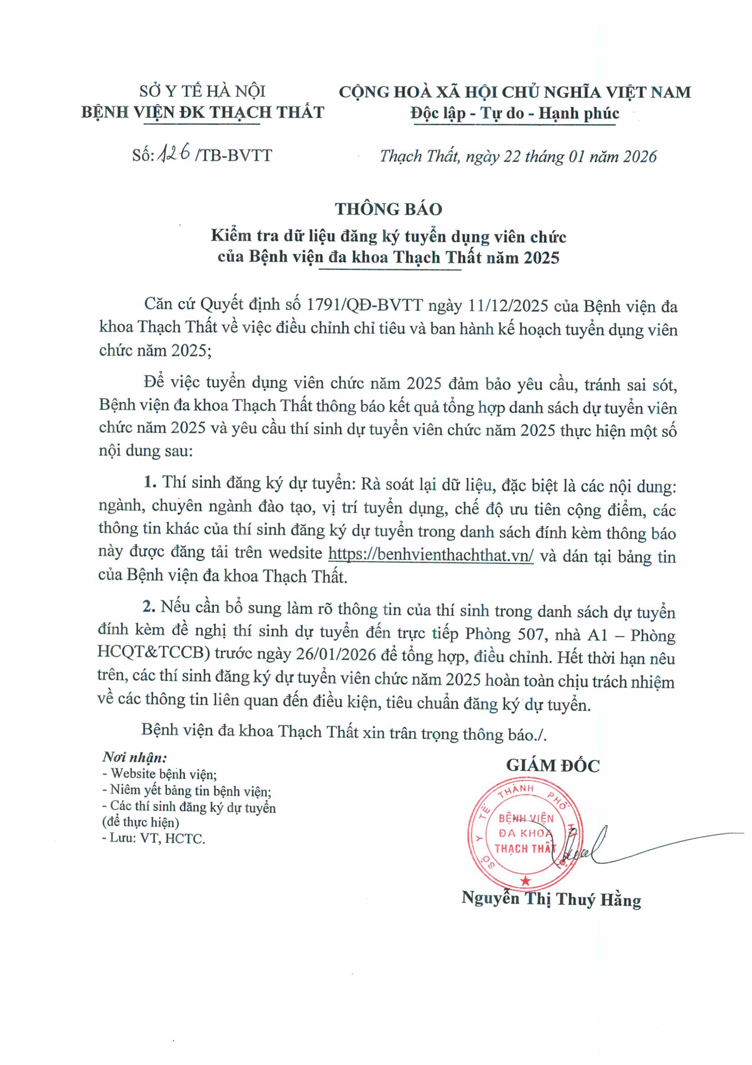 Thông báo về việc tuyển dụng viên chức vào làm việc tại Bệnh viện đa khoa Thạch Thất năm 2025