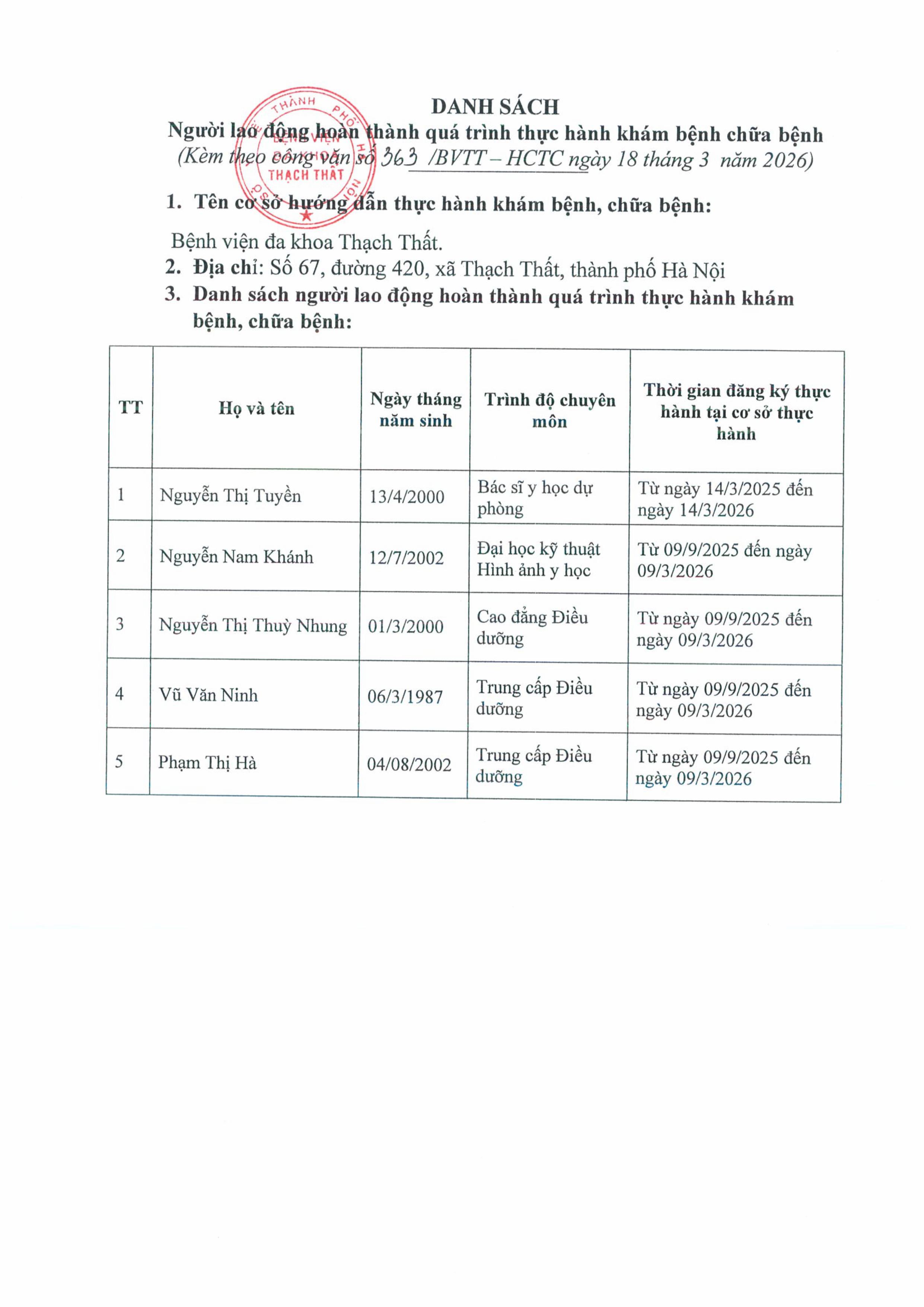 Thông báo người lao động hoàn thành quá trình thực hành tại Bệnh viện Thạch Thất tháng 3 năm 2026
